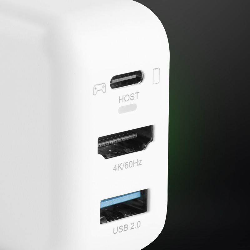 Combina alimentazione, ricarica e uscita video in un unico elegante adattatore.